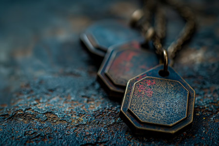 Rustic military dog tag with American flag design, symbolizing patriotism and honor, set against a dark, rough surface,