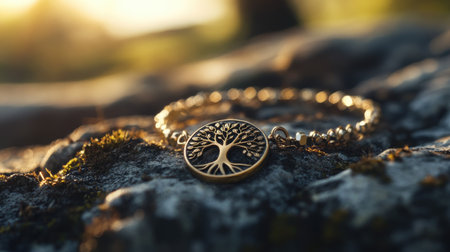 A metal necklace is suspended on a textured rock illuminated by the warm glow of a sunset background creating a serene atmosphere.