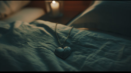 Heart shaped pendant on the bed. Valentine's Day concept.