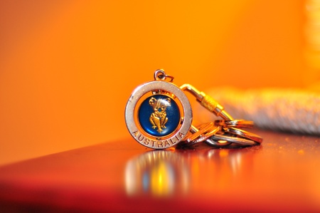 Heart shaped keychain on a wooden background. Close-up.