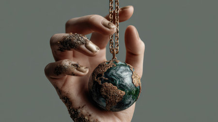 A stunning close-up of a hand delicately holding a green and gold earth pendant, showcasing the beauty of jewelry inspired by nature and sustainability.