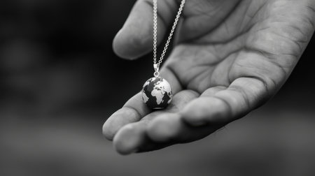 A graceful hand cradles a stunning silver globe pendant, capturing the essence of unity and connection in an artistic black and white aesthetic.
