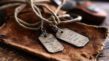 A rusty dog tag lying on a rustic background with the American flag in the blurred background, symbolizing military and patriotism.