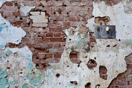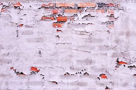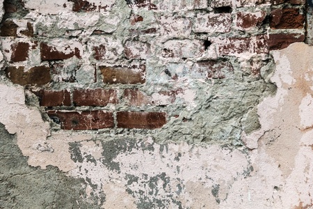 Old and worn red brick wall face with white and black cement coating peeling away.
