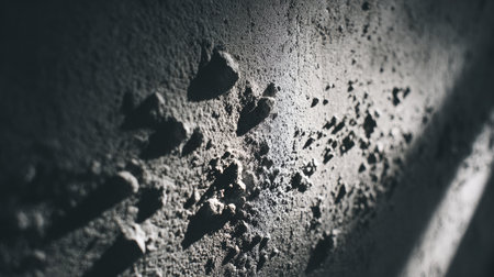 Highly detailed shot of damaged concrete wall showing exposed pebble aggregate, beige staining, rusty deterioration marks, and dramatic triangular midday shadow across the gray floor.