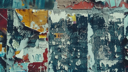 Grunge Wide Background with Old Torn Posters. Urban Graffiti Wall Texture. Grungy Ripped Wall with Torn Posters and Ads Background. Panoramic Urban Wallpaper. Graffiti Wall Texture.