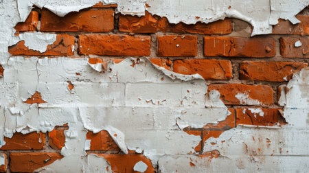 Peeling paint reveals textured surface of red bricks, showcasing blend of colors and patterns. weathered appearance adds character and depth to wall, evoking sense of history and age