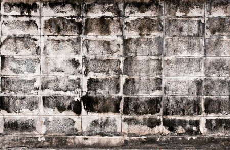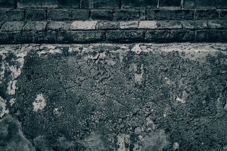 Black old brick building socle with cracked plaster and peeling paint.