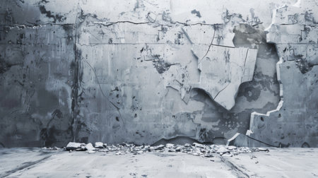 Wide shot of a dark, grunge industrial interior space featuring a rough gray cement wall with dramatic peeling sections exposing brown earth and grey rubble, highlighted by artificial light.