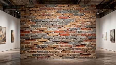 Rugged, multi-toned brick wall centered within a minimalist industrial art gallery, contrasting sharply against smooth white walls, concrete flooring, and exposed ceiling beams.