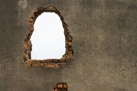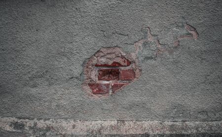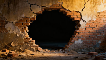 Dramatic close up of textured red brick wall with peeling yellow plaster, highlighting severe cracking and damage around a central black void for copy space usage.