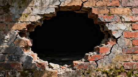 Harsh daylight illuminates the crumbling orange and gray masonry wall, highlighting the severe fractures surrounding a perfectly dark, ominous circular opening leading into deep shadow.