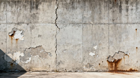 Grungy cement wall section in an industrial structure featuring a deep structural crack and flaking plaster near the base, dramatically highlighted by geometric sunlight and shadow patterns.