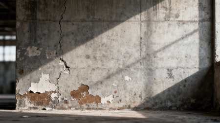 Abandoned industrial structure with a distressed cement wall exhibiting severe cracks and flaking plaster, intensely illuminated by triangular sunlight.