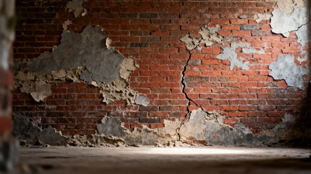Dramatic low light illuminates the damaged floor beneath a severe fracture running through the red brick and gray peeling stucco surface of a forgotten warehouse structure.