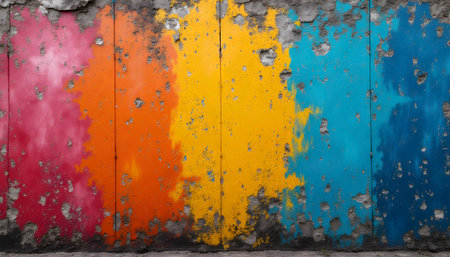 Aged wall with colorful peeling pieces of paint. Abstract wallpaper background. Created with Generative AI