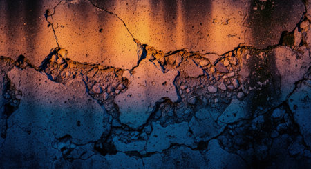 A bright colorful wall with multiple cracks. AI-generated.