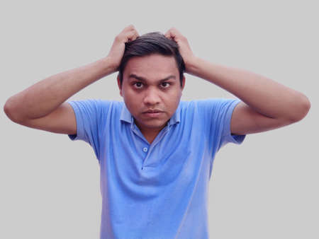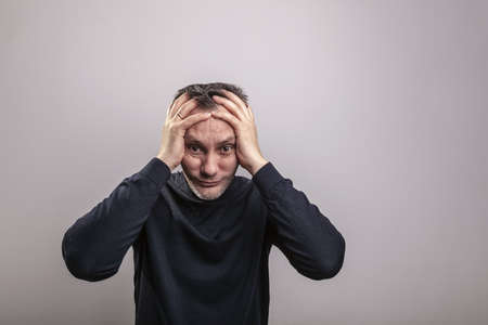 Portrait of unhappy desperate distressed young man with hands on head standing against grey studio background. Upset frustrated unsuccessful businessman or dumped boyfriend holding his head in despair