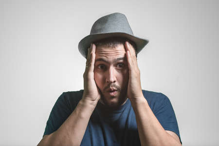 Portrait of a shocked Caucasian man in a cap and t-shirt, with an open mouth in surprise and big eyes.