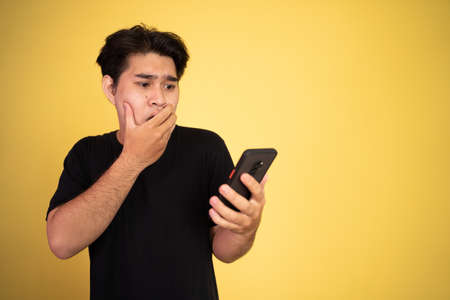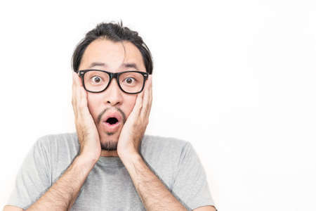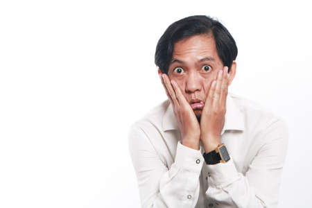 Portrait of young asian man in shock isolated on white. Crazy desperate man being shocked looking at camera with wide opened mouth. Anxious male trembling horror with fear. Negative emotions feelings concept