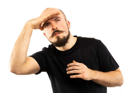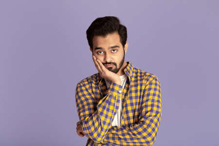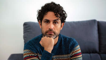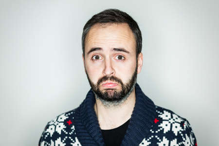 Portrait of adult bearded man with emotion of saddness on face looking at camera