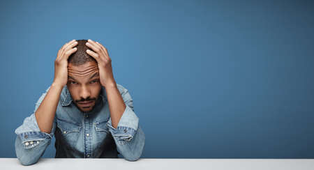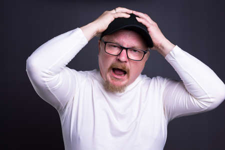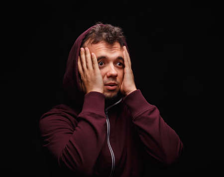 Helpless student holding his head in shock. Confused guy on a black background. Man with mental problems. Shock concept.