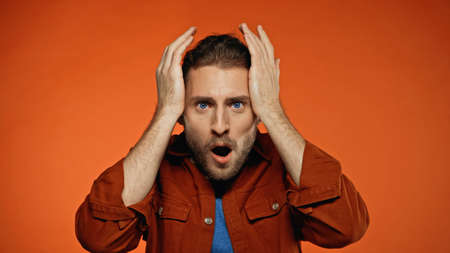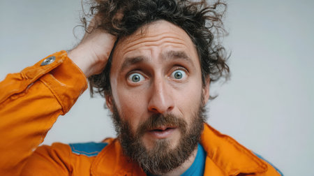 Curly-haired man in an orange jacket displays a surprised expression, emphasizing emotion and personality against a soft, neutral backdrop with copy space for text