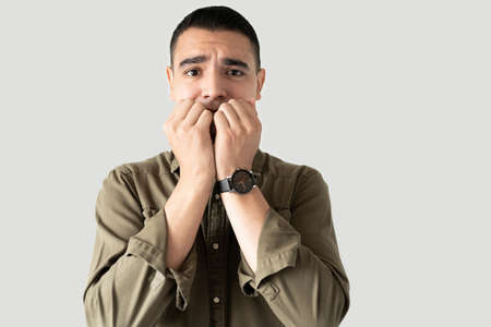 Closeup of an anxious young Latin man biting his fingernails and having a nervous breakdown
