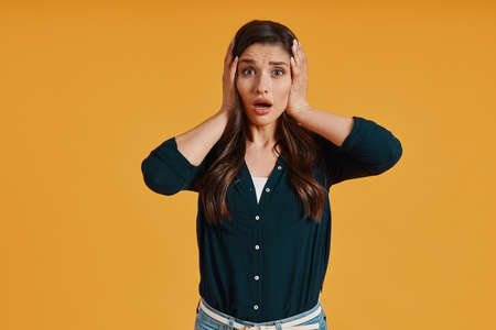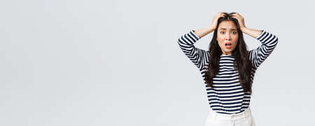 Lifestyle, people emotions and casual concept. Troubled young woman stare alarmed, feel bad as something awful happened, grab head and stare camera anxious, white background