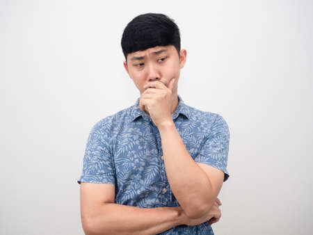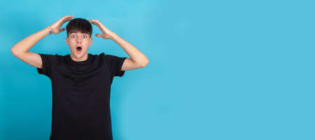 Frightened asian man shocked isolated over blue background. Stressed and depressed korean guy because of bad news.