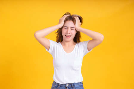 Portrait young asian woman stressed headache unhappy serious negative emotion in white t-shirt, Yellow background isolated studio shot and copy space.