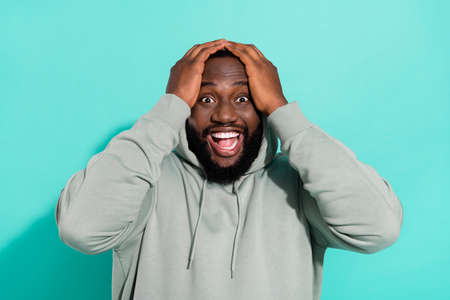 Photo of young astonished man face reaction open mouth impressed fail isolated over teal color background