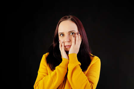 Portrait of young woman on black background. Pretty brunette in yellow hoodie posing on dark background