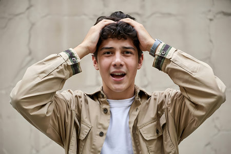 A young teenager exhibits a strong expression of overwhelm and anxiety. Hands are placed on his head in a gesture of frustration, capturing a moment of intense stress and emotion. The image conveys the struggles and challenges faced during adolescence.