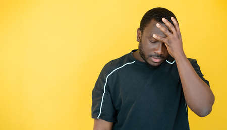 Facepalm gesture. Clueless man. Wtf reaction. Upset disappointed guy feeling epic fail covering face by hand isolated yellow copy space.