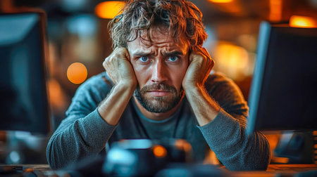 Frustrated man holding his head, staring at a computer screen, experiencing stress and technical issues.