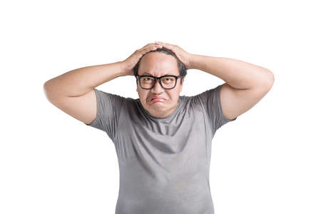 Asian man in eyeglasses with unhappy expression isolated over white background