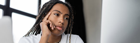 Shocked adult african american man in casual with open mouth, screaming and looking at free space