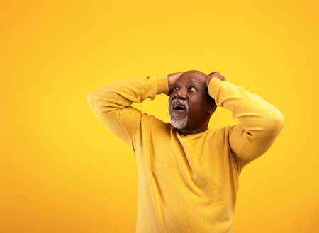Amazed emotional senior black man holding his head in shock, looking at copy space for your text or advertisement