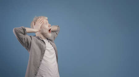 Wow, its unbelievable. Surprised albino guy seeing shocking advertisement, emotionally reacting, panorama, free space