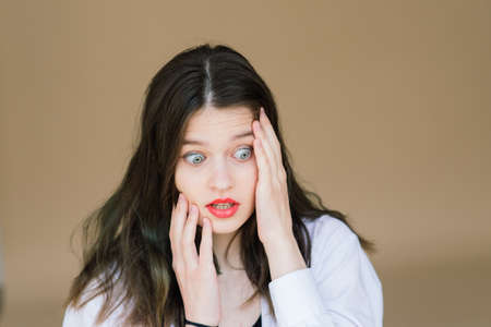 Emotional portrait of surprised woman. Amazement emotion. Studio isolated shot.