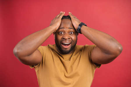 Scared and shocked African-American man holding head, looks at the camera in disbelief, dazed dark-skinned guy with mouth opened isolated on red