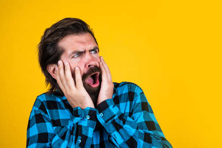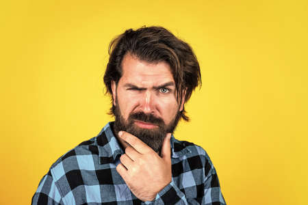 posing for photo. mature guy with moustache on face. expressing human emotions. serious man in checkered shirt. emotional man on yellow background. brutal bearded hipster