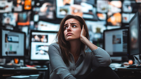 A young woman sits in a dramatic moment of stress in a cluttered workspace filled with computer screens. She reflects the challenges of digital overwhelm.