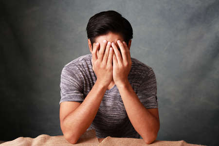 Asian miserable depressed man stay alone with sky background. Depression and mental health concept.