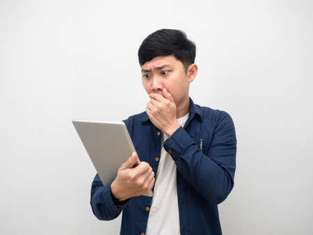 Man gesture close mouth looking at tablet in hand feeling shocked