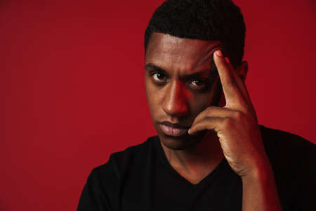 Young black man pointing finger at his temple and looking at camera isolated over red wall
