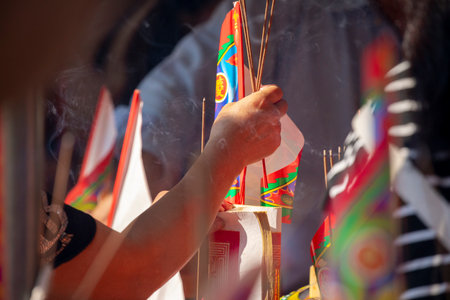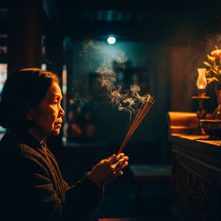 Incense Ritual An elderly woman lights multiple incense sticks before a small deity shrine her weathered hands shaking slightly representing her deeprooted beliefs and wishes for a.