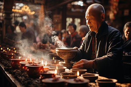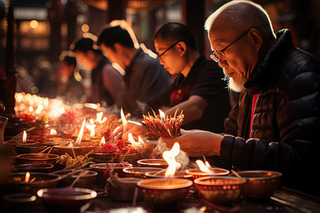 Chinese Temple Visits: People praying and making offerings at temples for blessings. Generated with AI