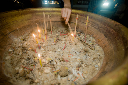 Burning incense and candles at thai buddhis celebration - Visakha Bucha Day